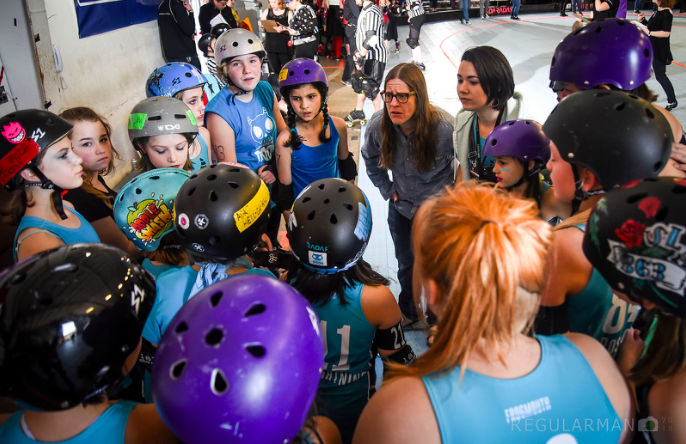 Hedy “Headache” Stevens, a coach for the Daughters of Doom, listens to feedback from her players during their bout with the Voodoo Dolls this past March. (Photography Credit: Regularman Photography)