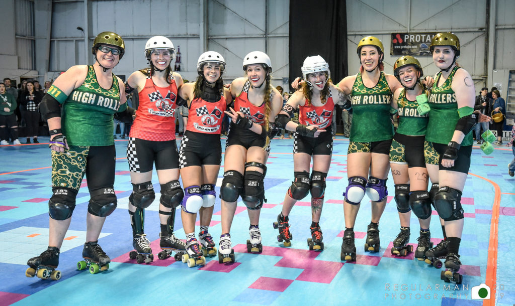 Led by a staunch defense and strong jamming, the High Rollers (HR) handed the Breakneck Betties (BNB) their first loss of the season on with a score of 130-122 on March 16th. Tough defensive play prevented either team from building up much of a lead throughout the bout. The HR defense held three of the Betties’ four jammers to a combined 12 points in the first half. A stellar performance from HR jammer Polly Wanna Crack’er—who led her team with 68 total points—helped hold of a second-half surge by the Betties and secure the win for the High Rollers. The Betties’ Ovarian Barbarian led all scorers with 71 points and was recognized as the team’s MVP jammer.