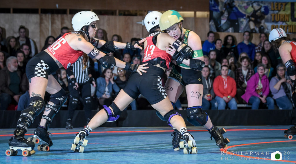 Both teams’ defenses remained tough in the second half. The High Rollers managed to secure lead jammer in each of the first five jams but only managed one scoring pass each time. This offensive and defensive consistency allowed the HR to build up a 23-point advantage (110-87) by jam 13, their largest of the night.