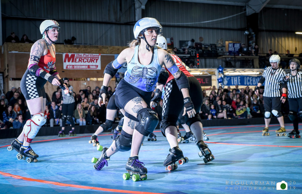 From left: Tegan N Scare-Ya (captain), Adrinaline Crush (captain), Yermom’s Favorite (MVP Blocker), Tenacity (captain), Sprout (captain), Bella Constrictor (MVP Blocker), Freddie Herfury (MVP Jammer), Beyond Thunderdame (MVP Jammer). Photography Credit: Regularman Photography.